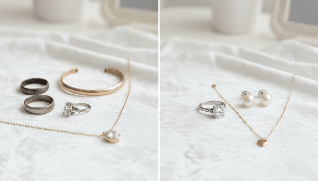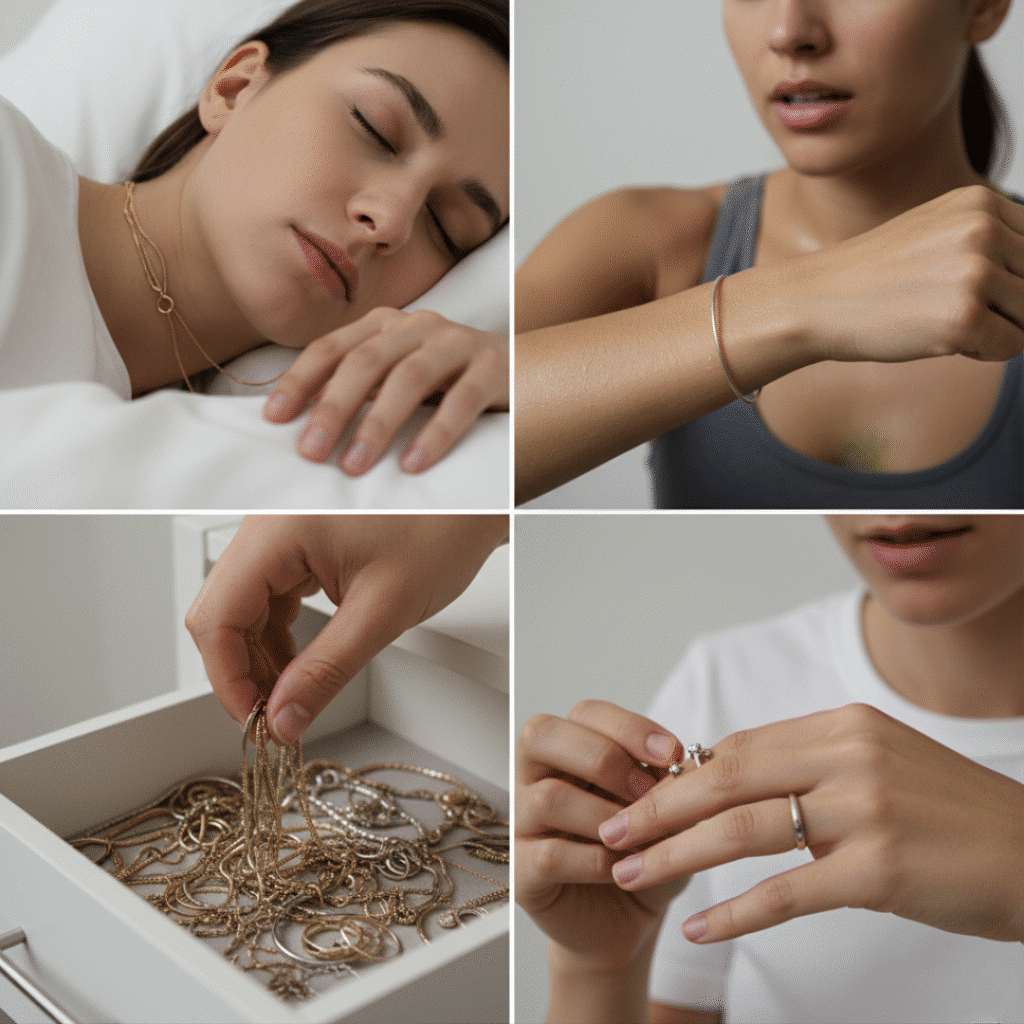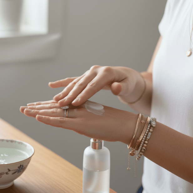 Why this matters: Products need time to absorb into skin. Jewelry put on too early becomes a magnet for chemicals that cause long-term damage.