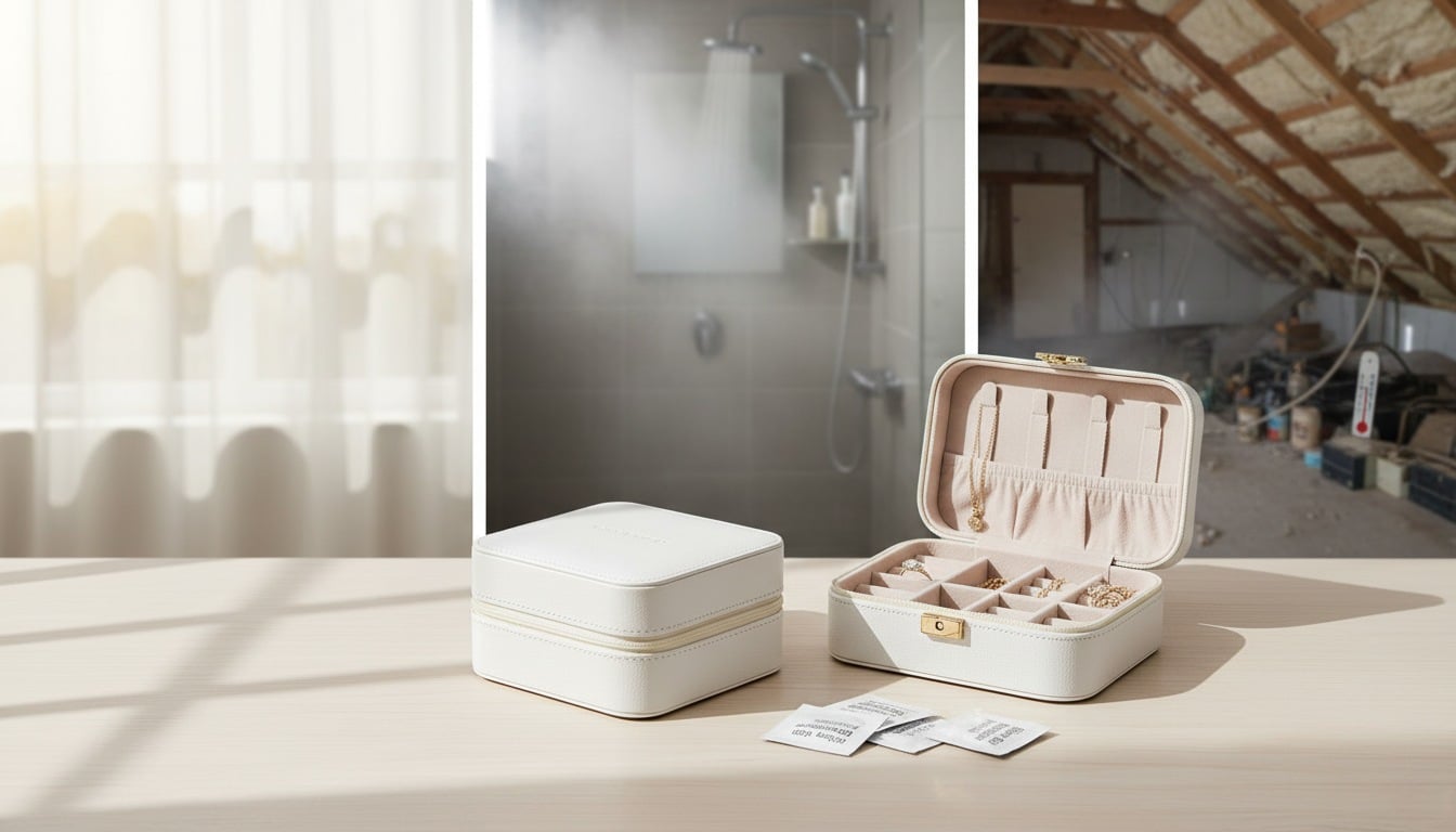 No, bathrooms are the worst place for jewelry storage due to: high humidity from showers, temperature fluctuations, exposure to hair and beauty product chemicals, steam and moisture that accelerate tarnishing, and poor security for valuable pieces.
