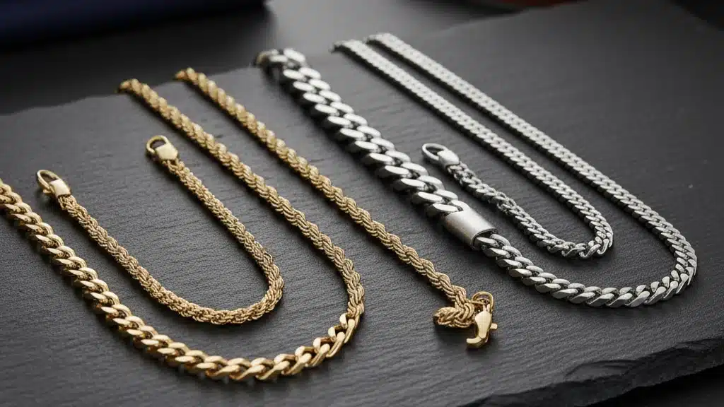 24. Chain Necklaces Masculine chains in gold or silver work for casual or dressed-up looks. Consider length preferences – shorter for under shirts, longer for over clothing.